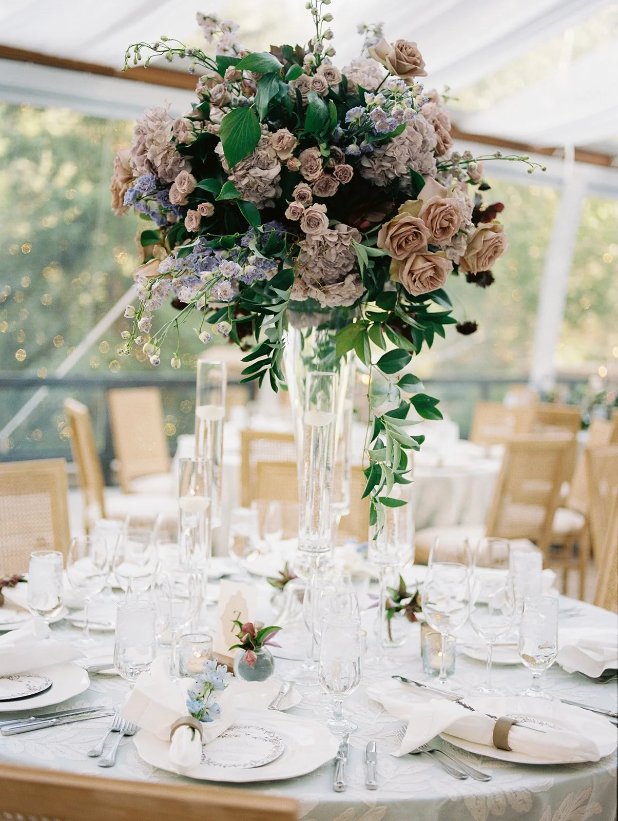 Lush, layered floral arrangements were featured throughout—from the ceremony and cocktail hour to the reception tablescapes. Varied heights and textures ensured the florals added dimension without overwhelming the space.