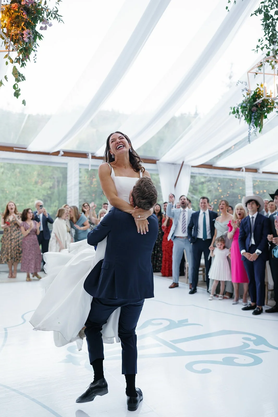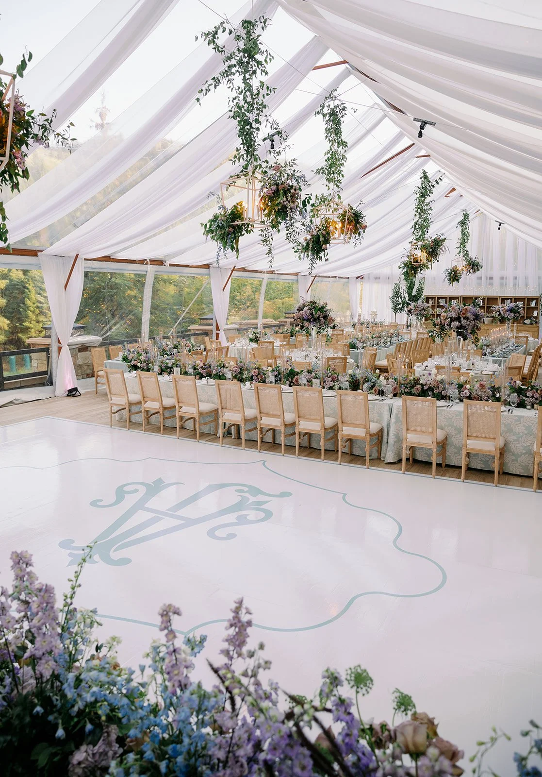 The bespoke vinyl dance floor was both functional and beautiful, serving as the focal point of the tented space and inviting guests to dance the night away.