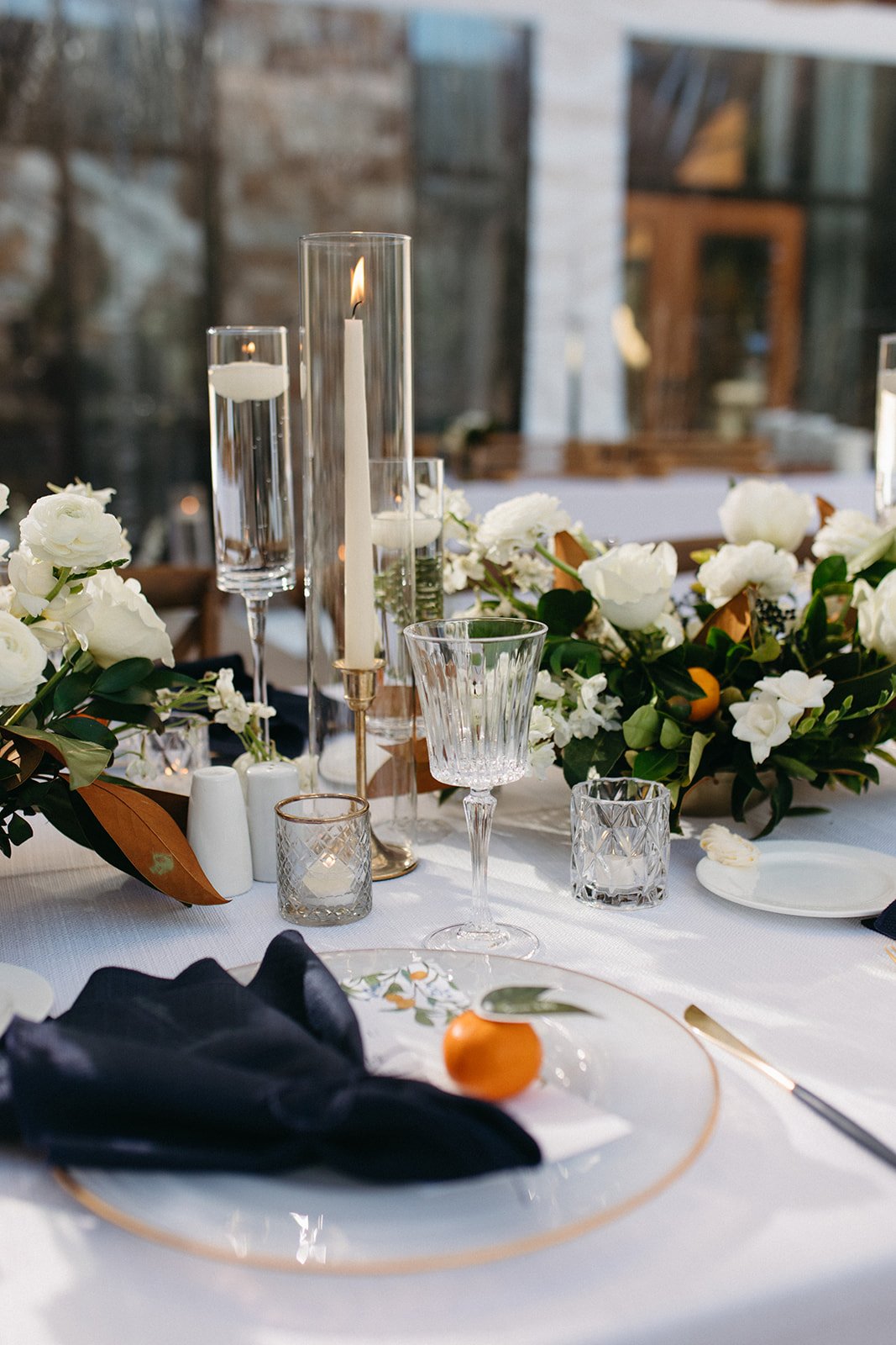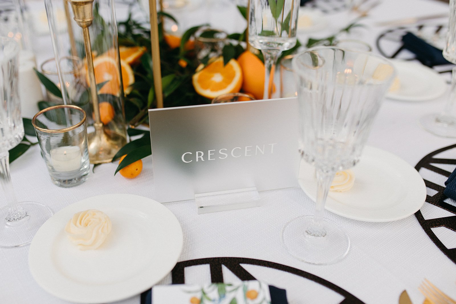 Upon entry into the clear-top tent, guests were greeted by a classic navy and white color palette, complemented by an abundance of greenery and a touch of citrus for a truly elegant, playful, and unique design. The place settings featured a mix of black geometric and gold-rimmed glass chargers, gold and navy flatware, navy linen napkins, custom menus, and an orange with a faux leaf to serve as the place card. Each table was finished off with a centerpiece full of fluffy white blooms and magnolia leaves with a touch of deep blue berries and citrus to complete the look.