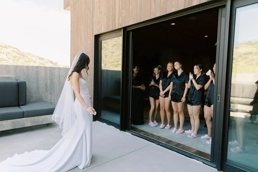 The day began quietly in the peaceful suites of Blue Sky, where Cristiana and her bridal party prepared for the events ahead. The setting, with its modern alpine architecture and floor-to-ceiling windows, created a serene backdrop for hair, makeup, and a champagne toast. Cristiana wore a structured off-the-shoulder gown that balanced bold simplicity with refined elegance. Her look was completed with glowing makeup and soft waves, perfectly suited for the mountain landscape. Austin got ready nearby with his groomsmen, donning a timeless black tux before heading to the ceremony site.