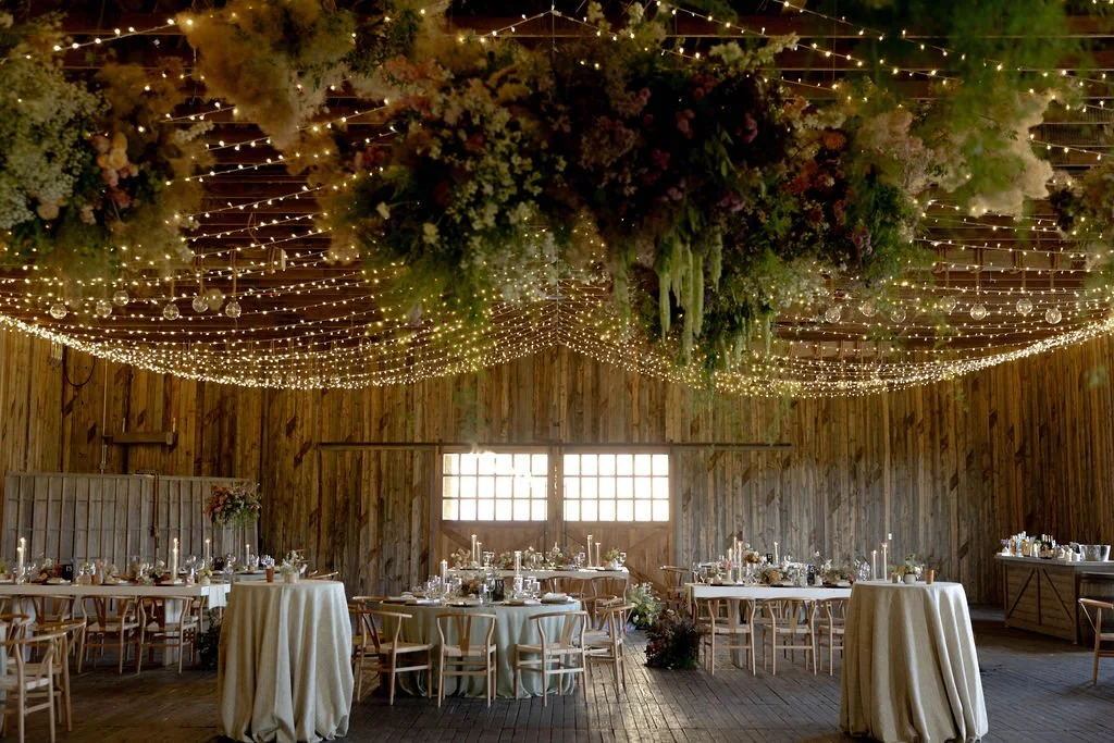 As the sun dipped behind the mountains, guests were invited inside the arena for a plated dinner and an unforgettable evening of celebration. The indoor reception space was transformed with a canopy of glowing bistro lights that added warmth and intimacy to the grand, rustic setting.